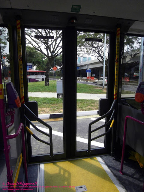 The door system. There are two additional small grab poles at each side of the exit, below the ezlink card reader. |